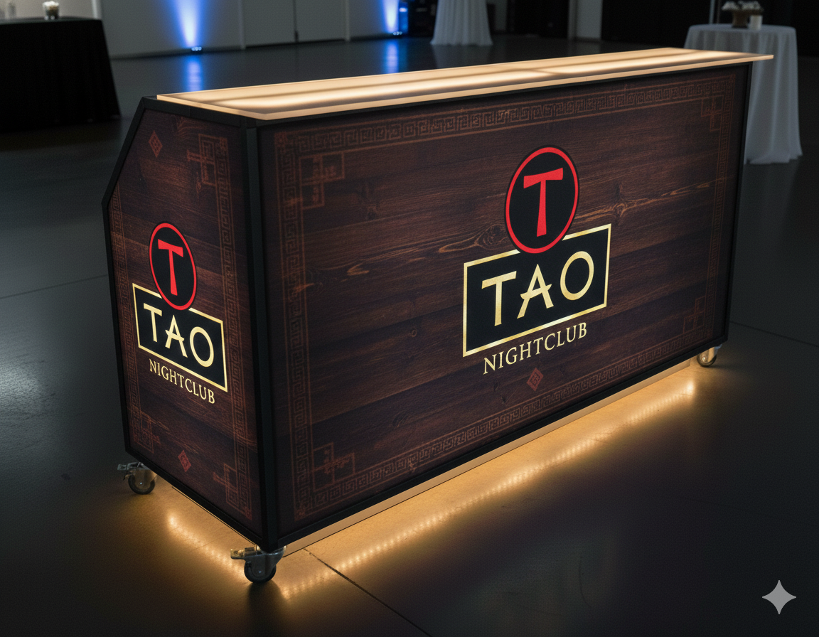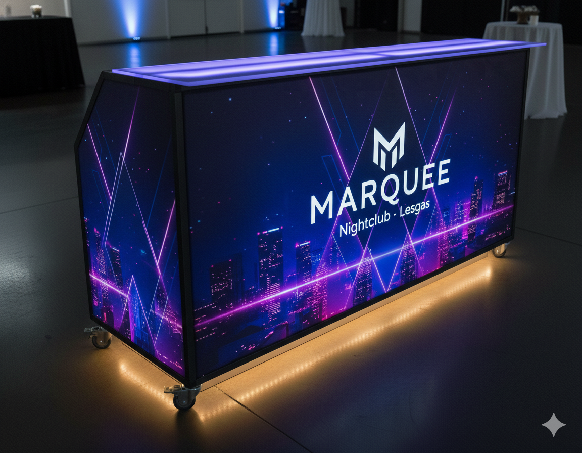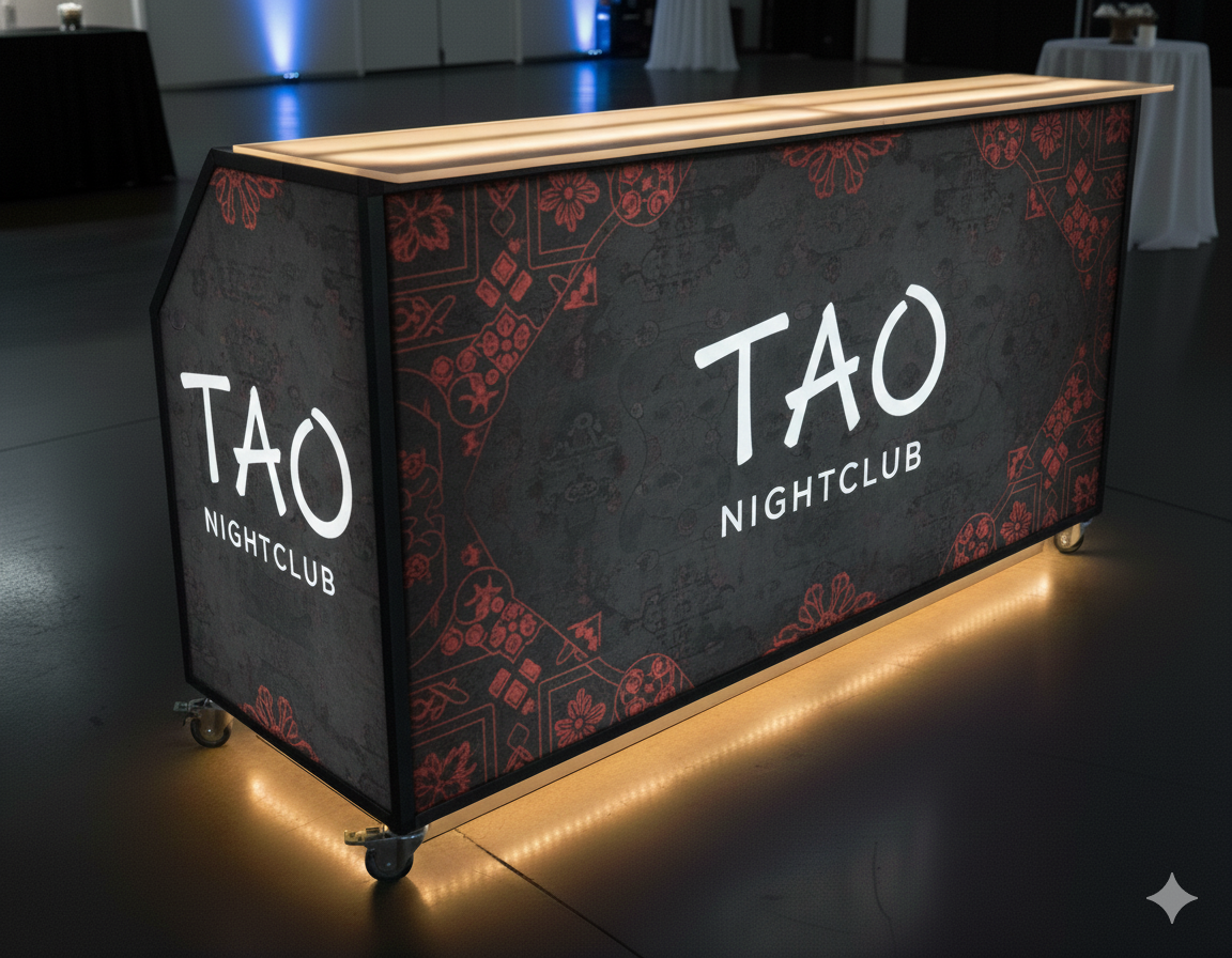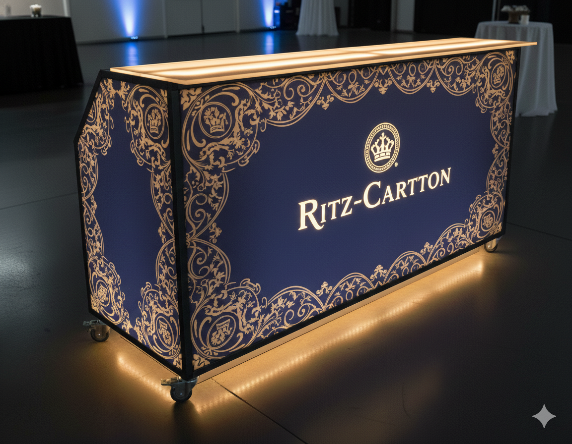 Keywords: custom mobile bar, LED portable bar, branded event bar, folding bar with lights, UV printed bar, portable cocktail station, mobile bar for weddings, resort bar rental, liquor brand activation bar.