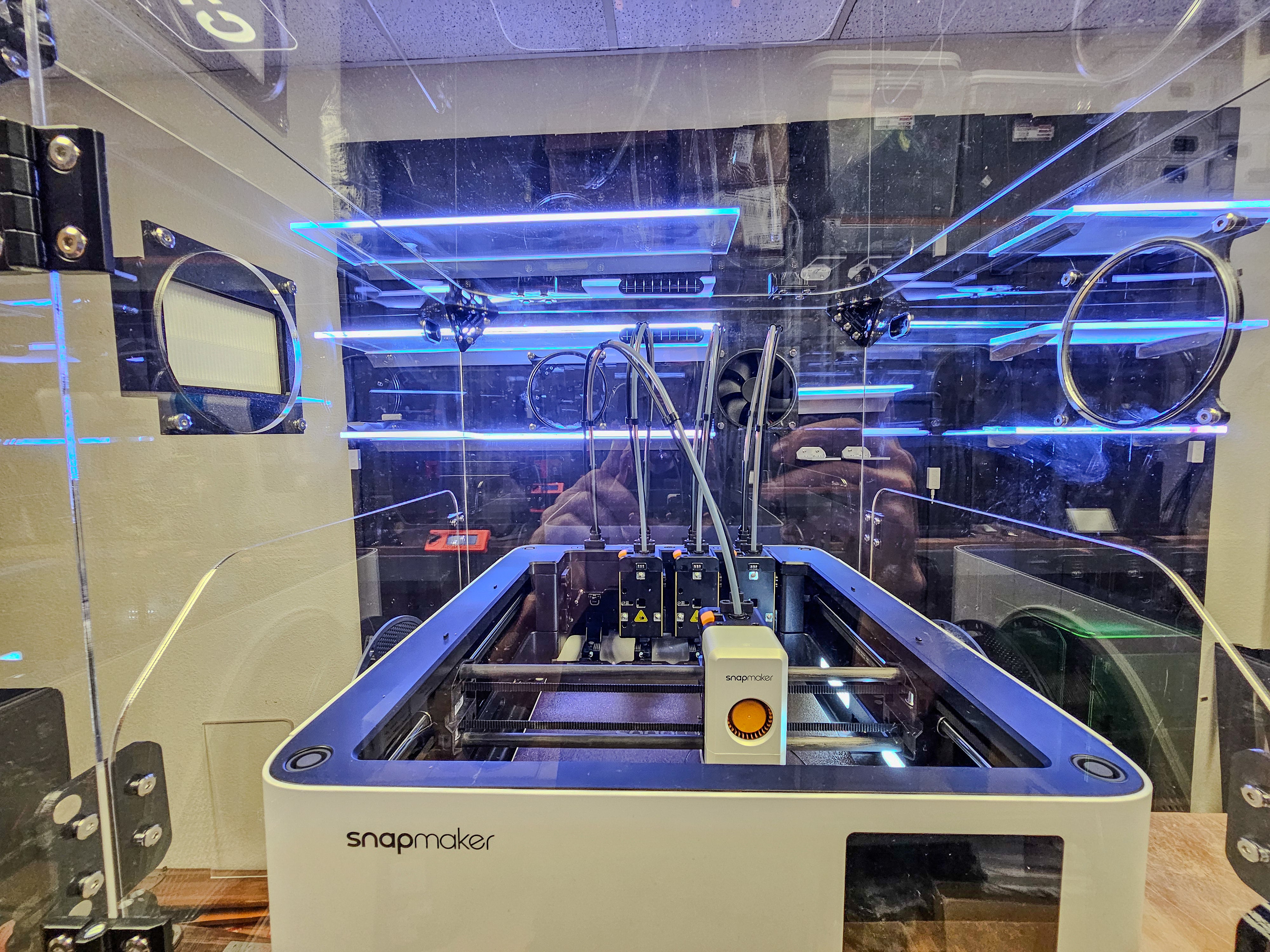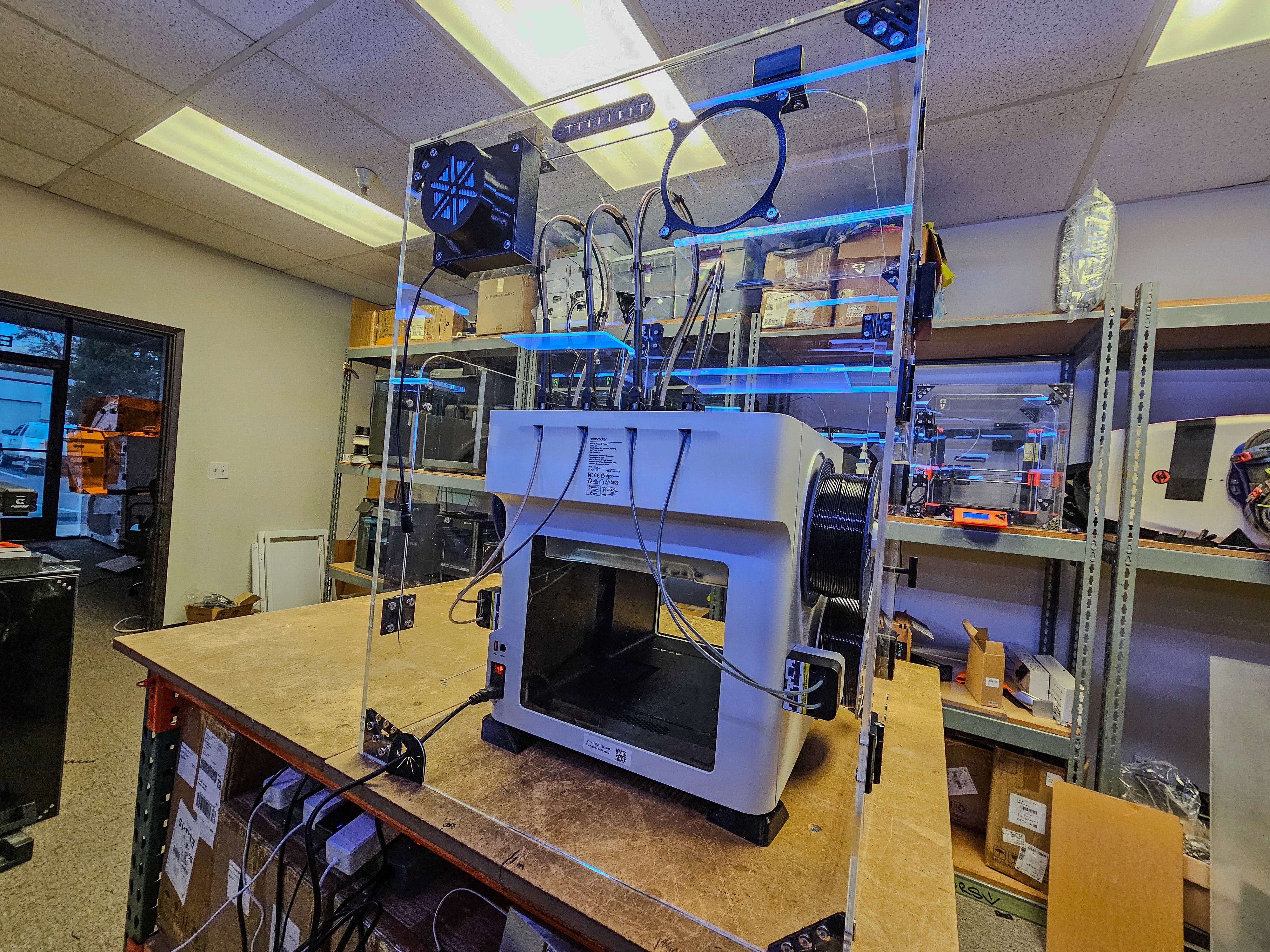 The Snapmaker U1 External Enclosure V2 addresses the Snapmaker user base’s needs, offering a spacious design to fit the printer alone. It isolates fumes and particulates more effectively than the stock filter, providing a controlled environment ideal for garages or homes with kids, with ample access via its frame-less door and side panel.